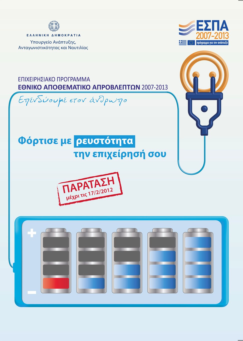 National Reserve - 24/11/2011Enterprises are boosted with funds, covering their entire (100%) business plan, up to the amount of €20.000, provided they create one new job of one year duration, they are funded with an additional amount of €15.000. View information about "National Reserve" programme | ![]() |