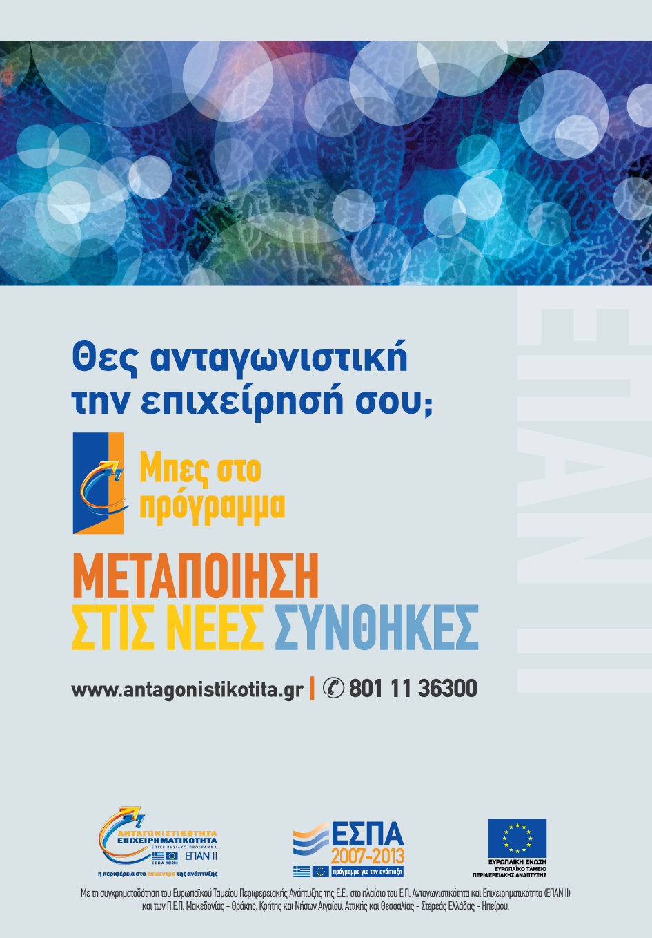 Manufacturing under new conditions - 9/9/2010The “Manufacturing under new conditions” Programme of EPAN II targets existing, newly formed or under establishment enterprises, which are small and very small in size and are active in Greece in the sectors of manufacturing and supporting services. View information about "Manufacturing under new conditions" programme | ![]() |