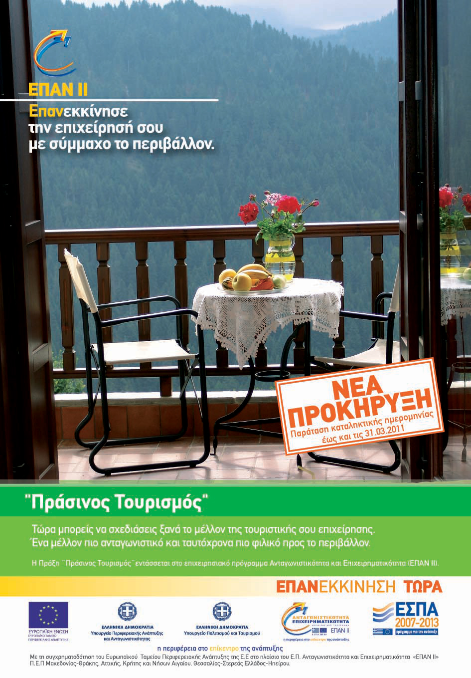 Green Tourism - 20/1/2011“Green Tourism” which is part of the Operational Programme Competitiveness & Entrepreneurship (EPAN II) is helping you re-design the future of your tourism business, making it more competitive and environmentally friendly. View information about "Green Tourism" programme | ![]() |